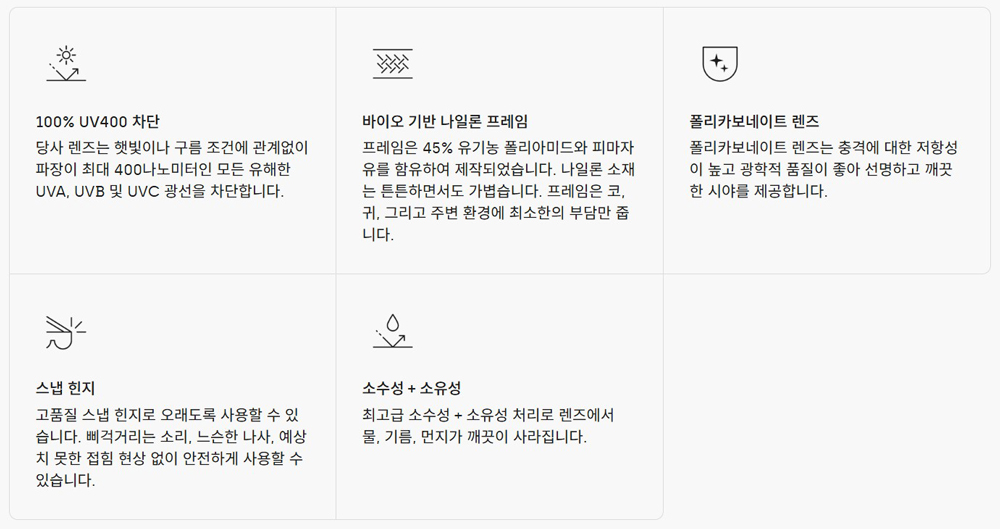 폴리카보네이트 소재의 렌즈는 뛰어난 충격 내구성과 우수한 광학 품질을 자랑하여 선명하고 깨끗한 시야를 제공합니다. 100% 자외선 차단 렌즈는 날씨에 관계없이 모든 유해 광선을 차단합니다.